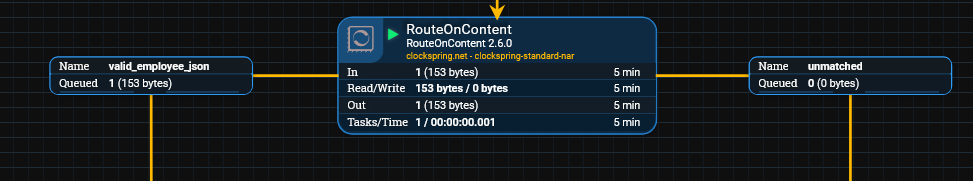As this RegEx completely matches our JSON, the flowfile is routed to the relationship with our property name of 'valid_employee_json'